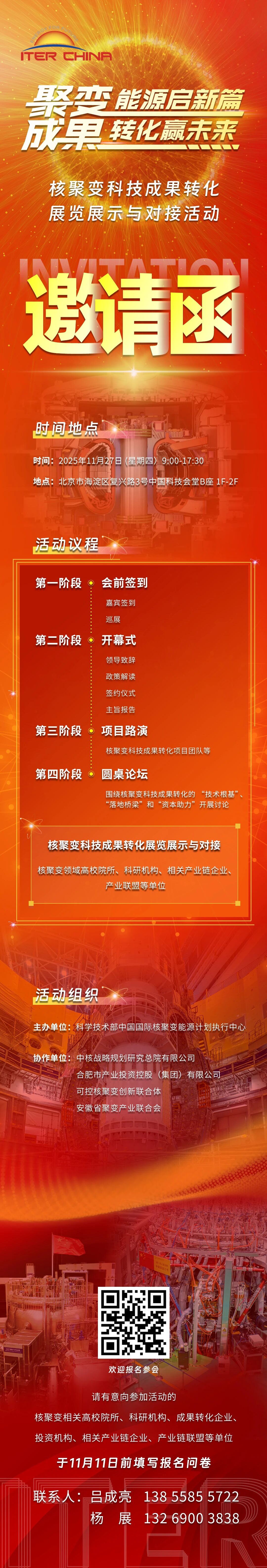 随着全球核聚变商业化进程不断加速,为集中展示我国参与ITER计划十余年来在超导材料、等离子体控制等关键领域取得的丰硕成果,助力我国核聚变科技成果转化与产业发展,科技部核聚变中心联合合肥产投集团、中核战略研究总院、安徽省聚变产业联合会、可控核聚变创新联合体等机构拟于11月27日在北京举办国内首届核聚变科技成果转化展览展示与对接活动,现诚挚邀请您拨冗参加!
