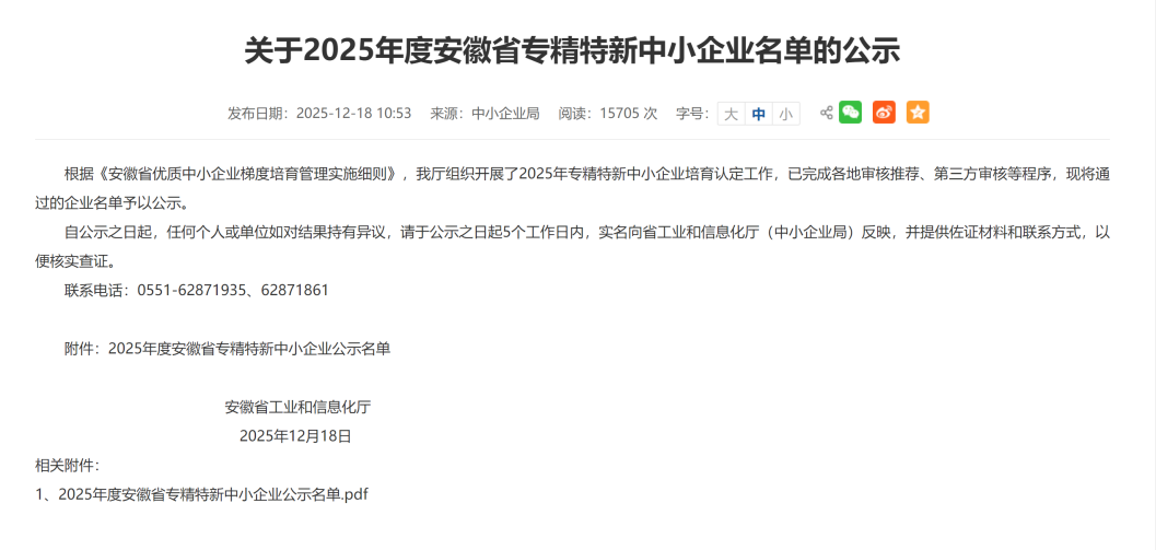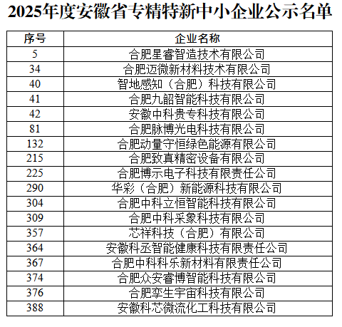 近日,安徽省工业和信息化厅公示了2025年度“专精特新”中小企业名单,合肥市种子基金群支持的18家企业成功入选本次名单。 迄今,合肥市种子基金群已累计培育23家企业成长为省级“专精特新”,培育实效显著。